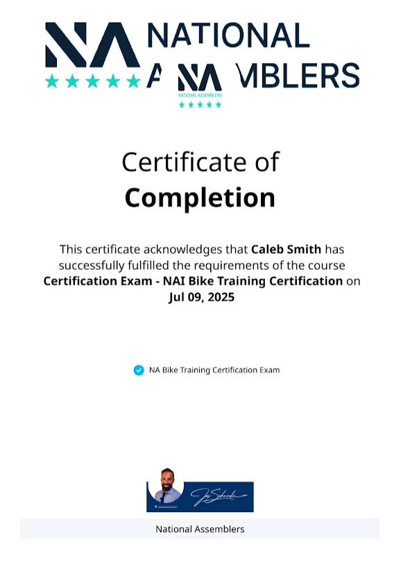At Bald Peak, your bike is in the hands of a certified technician. I’ve completed Level 2 Technician Training through the EdApp program with National Assemblers, covering everything from basic tune-ups and cable systems to advanced hydraulic brakes and drivetrain service.
